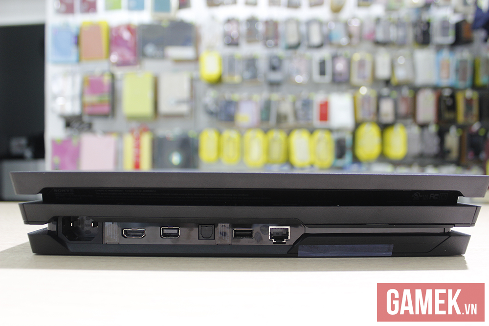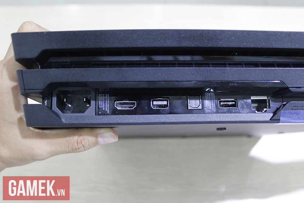 Mặt sau máy hỗ trợ các cổng kết nối quen thuộc gồm HDMI OUT, LAN, AUX được bố trí lại và không còn cổng opical. Một chi tiết khác so với bản tiền nhiệm là người dùng có thể thay thế ổ cứng dễ dàng, đơn giản hơn thông qua khe có nắp đậy ở cạnh hông và phía sau máy mà không cần phải tháo cả nắp trên. Việc tăng thước giúp PS4 Pro khiến khả năng tản nhiệt của máy sẽ được hỗ trợ mạnh mẽ với. Với cấu trúc mới, người dùng nên đặt PS4 Pro ở chỗ thoáng để không khí lưu thông tốt hơn giúp tuổi thọ máy cao hơn.