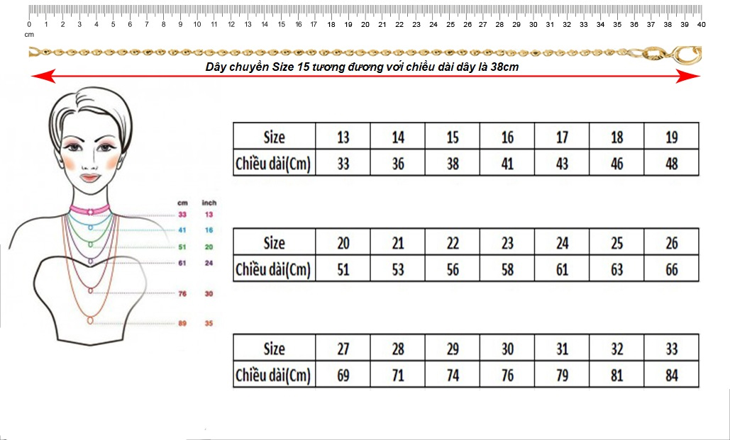 - Size dây phổ biến của thường có đối với dây chuyền là size 18 và các size chênh lệch trong khoảng [16-20
