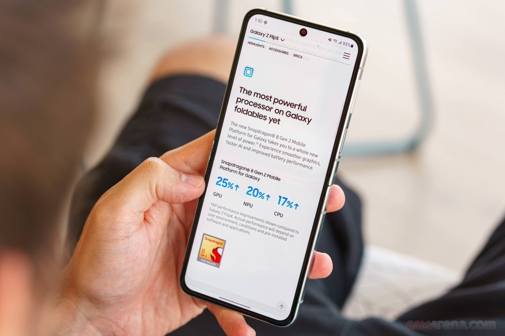 Samsung Galaxy Z Flip5 được trang bị chipset Snapdragon 8 Gen 2 (4 nm) mạnh mẽ. Nó có dung lượng pin 3700 mAh và sạc nhanh 25W.