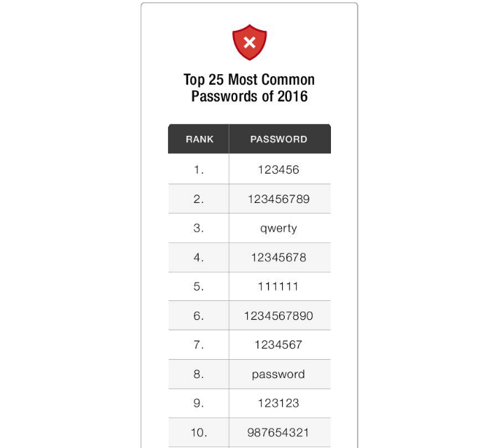 Công ty này đã soát qua 10 triệu mật khẩu lộ ra ngoài trong hàng chục vụ rùm beng bảo mật hồi năm 2016, và họ phát hiện ra rằng 17% người sử dụng “123456” để làm mật khẩu cho mình. Cụm “123465798”, “qwerty” hay “password” vẫn có được chỗ đứng trong danh sách 25 Mật khẩu Thông dụng nhất năm 2016.