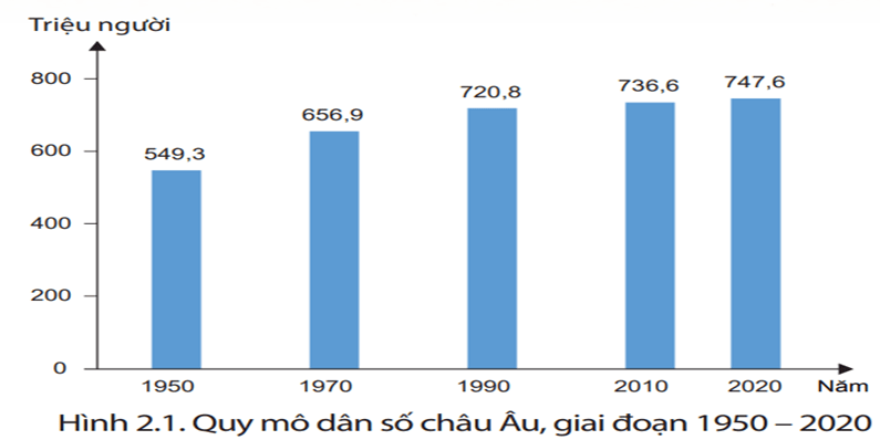 Câu 6. Dựa vào hình 2.1 em hãy nhận xét sự thay đổi quy mô dân số châu Âu trong giai đoạn 1950 – 2020.
