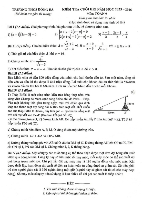 Đề cuối HK1 Toán 9 năm 2025 – 2026 trường THCS Đống Đa – Hà Nội 18/12/2025