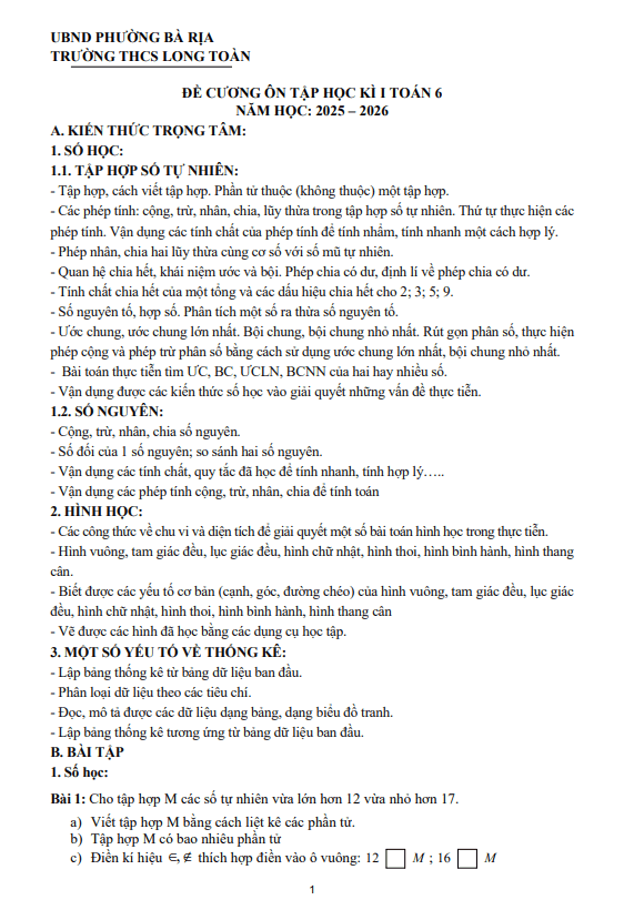 Đề cương cuối học kì 1 Toán 6 năm 2025 – 2026 trường THCS Long Toàn – TP HCM