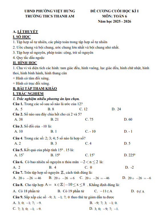Đề cương cuối học kì 1 Toán 6 năm 2025 – 2026 trường THCS Thanh Am – Hà Nội