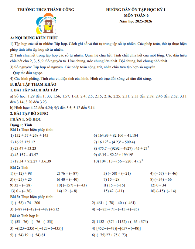 Đề cương cuối kỳ 1 Toán 6 năm 2025 – 2026 trường THCS Thành Công – Hà Nội