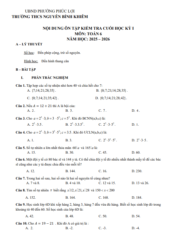 Đề cương học kì 1 Toán 6 năm 2025 – 2026 trường THCS Nguyễn Bỉnh Khiêm – Hà Nội