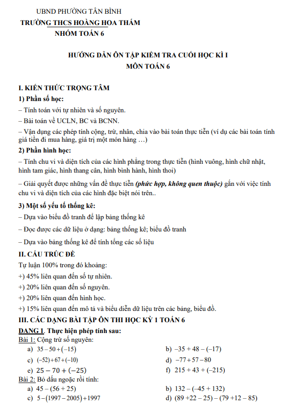 Ôn tập cuối học kì 1 Toán 6 năm 2025 – 2026 trường THCS Hoàng Hoa Thám – TP HCM