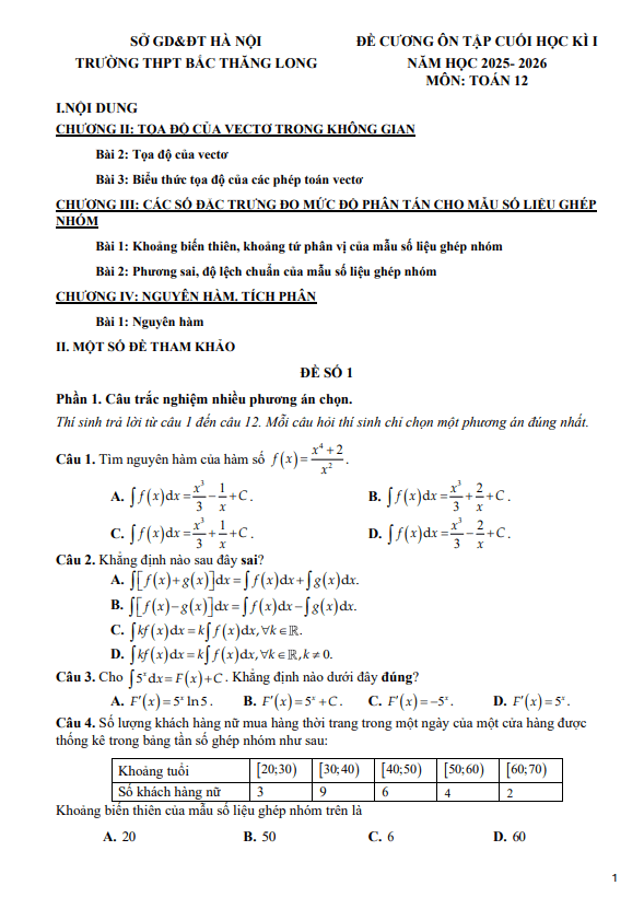Đề cương cuối kì 1 Toán 12 năm 2025 – 2026 trường THPT Bắc Thăng Long – Hà Nội