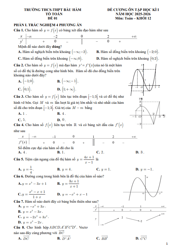 Đề cương học kì 1 Toán 12 năm 2025 – 2026 trường THCS-THPT Bàu Hàm – Đồng Nai
