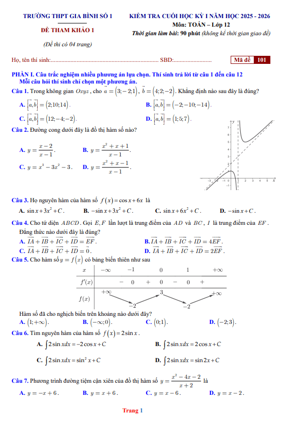 Đề cương học kỳ 1 Toán 12 năm 2025 – 2026 trường THPT Gia Bình 1 – Bắc Ninh