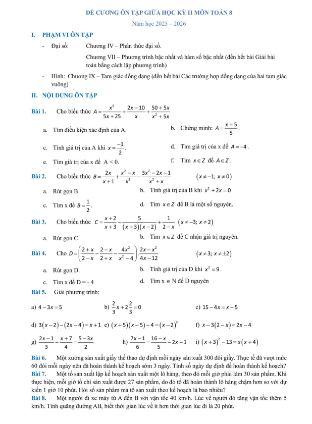 Đề cương giữa kỳ 2 Toán 8 năm 2025 – 2026 trường THCS Lê Ngọc Hân – Hà Nội 12/02/2026
