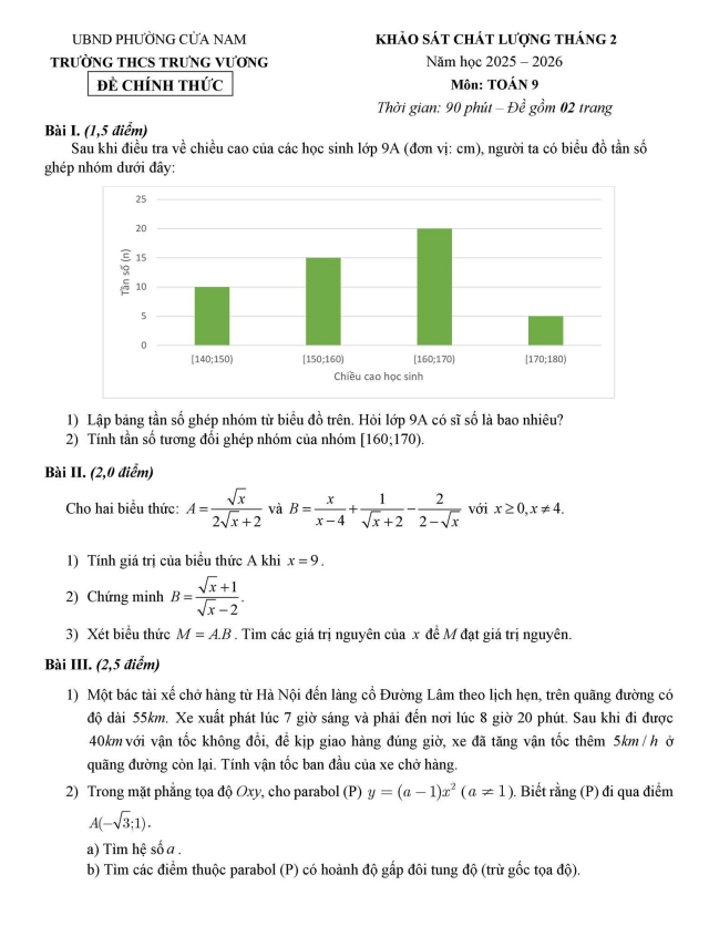 Đề khảo sát Toán 9 tháng 2 năm 2026 trường THCS Trưng Vương – Hà Nội 12/02/2026