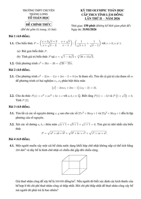 Đề thi Olympic Toán THCS lần 2 năm 2026 trường chuyên Thăng Long – Lâm Đồng 12/02/2026