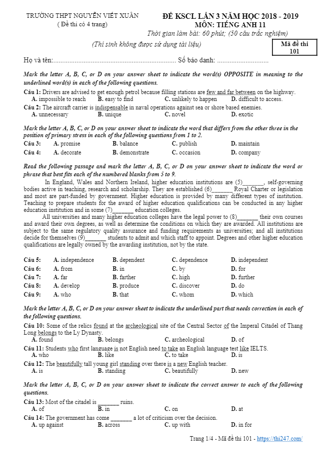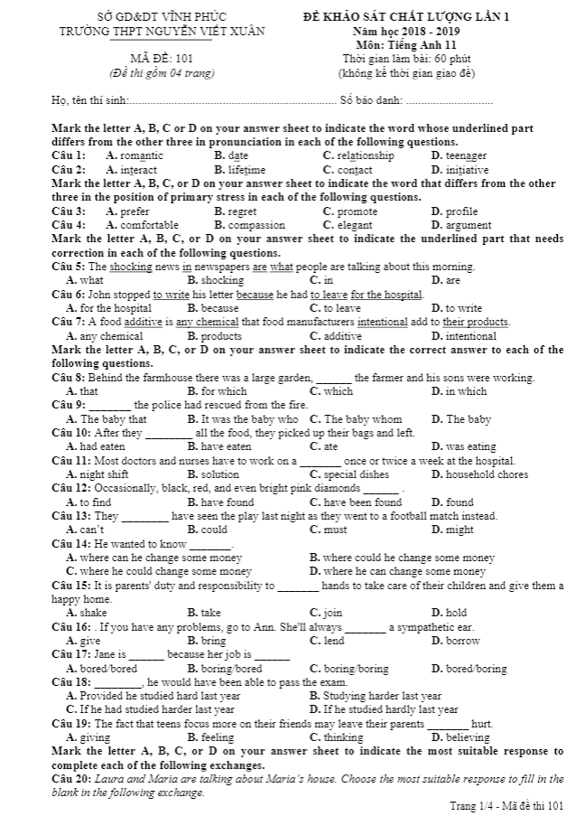 Đề khảo sát Tiếng Anh 11 đầu năm 2019 – 2020 trường Nguyễn Viết Xuân – Vĩnh Phúc