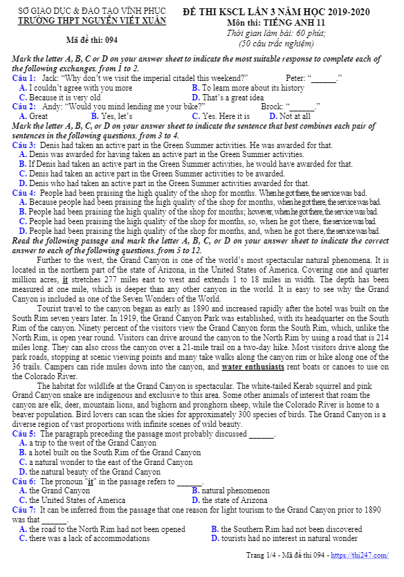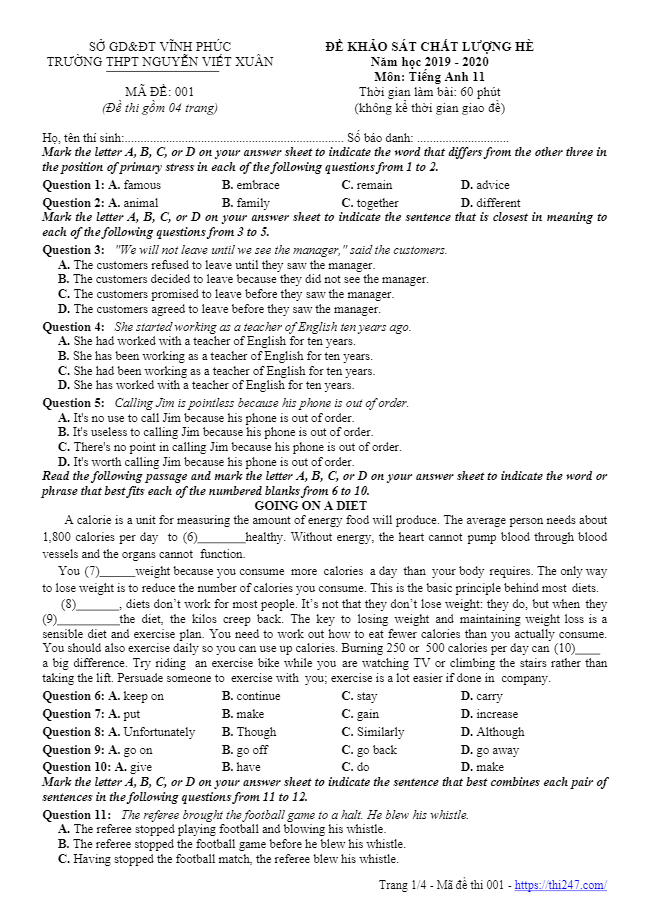 Đề khảo sát Tiếng Anh 11 lần 2 năm 2019 – 2020 trường Nguyễn Viết Xuân – Vĩnh Phúc