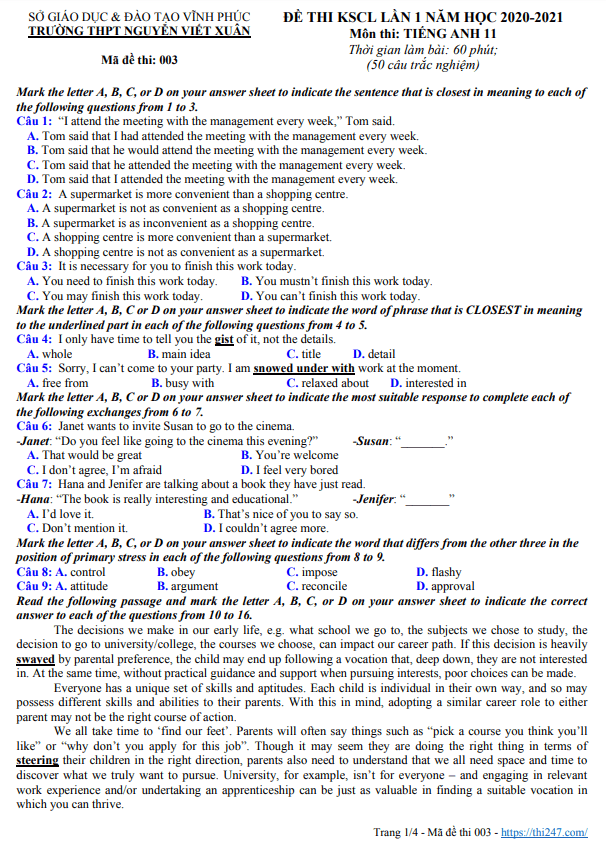 Đề khảo sát Tiếng Anh 11 lần 1 năm 2020 – 2021 trường Nguyễn Viết Xuân – Vĩnh Phúc