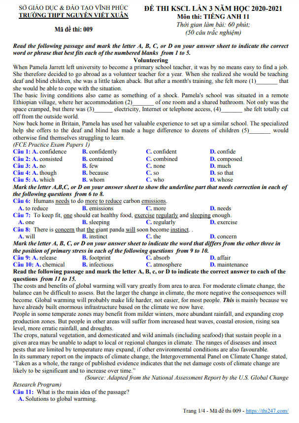 Đề khảo sát Tiếng Anh 11 lần 3 năm 2020 – 2021 trường Nguyễn Viết Xuân – Vĩnh Phúc