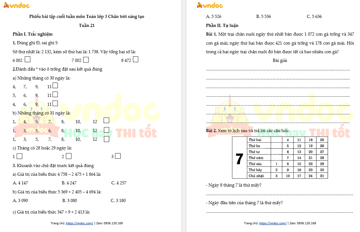 Phiếu Bài Tập Toán Lớp 3 - Tuần 21 - Học Toán 123