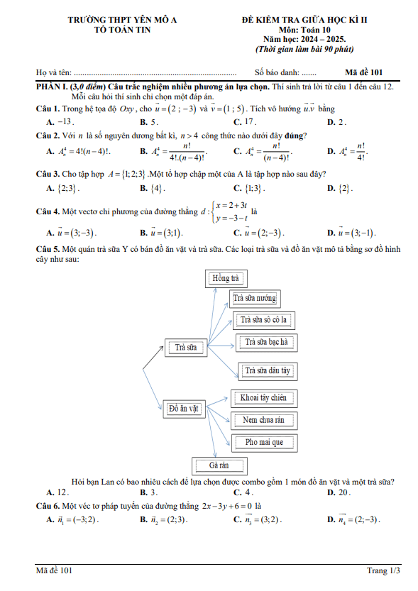 Đề giữa học kì 2 Toán 10 năm 2024 – 2025 trường THPT Yên Mô A – Ninh Bình