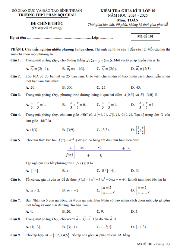 Đề giữa kì 2 Toán 10 năm 2024 – 2025 trường THPT Phan Bội Châu – Bình Thuận