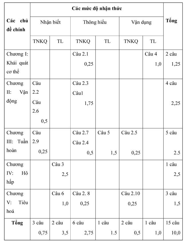 Đáp án đề thi học kì 1 Sinh học 8 số 1