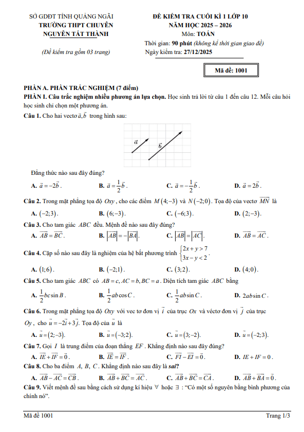Đề cuối kì 1 Toán 10 năm 2025 – 2026 trường chuyên Nguyễn Tất Thành – Quảng Ngãi