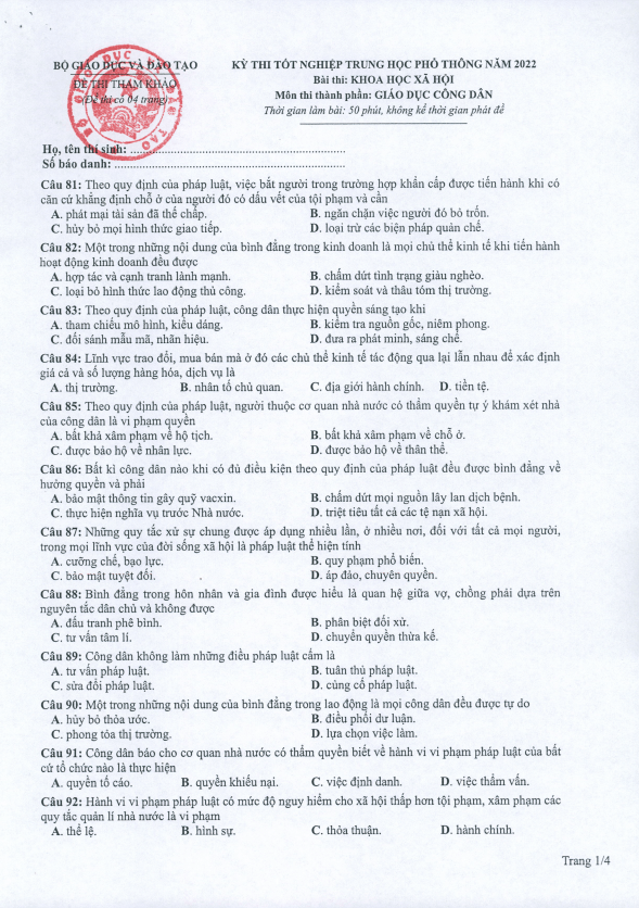 Đáp án 24 Mã đề Môn GDCD Của Bộ GDĐT Kỳ Thi THPT Quốc Gia ...