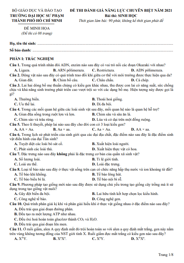 Đề thi ĐGNL chuyên biệt 2021 môn Sinh học trường ĐH Sư phạm TP Hồ Chí Minh