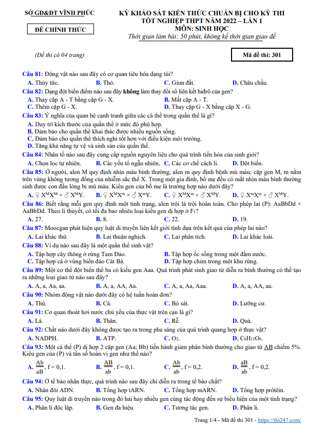 Đề thi thử tốt nghiệp THPT 2022 môn Sinh học lần 1 sở GD&ĐT Vĩnh Phúc