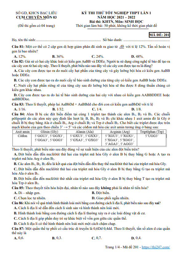 Đề thi thử tốt nghiệp THPT 2022 lần 1 môn Sinh học sở GDKHCN Bạc Liêu