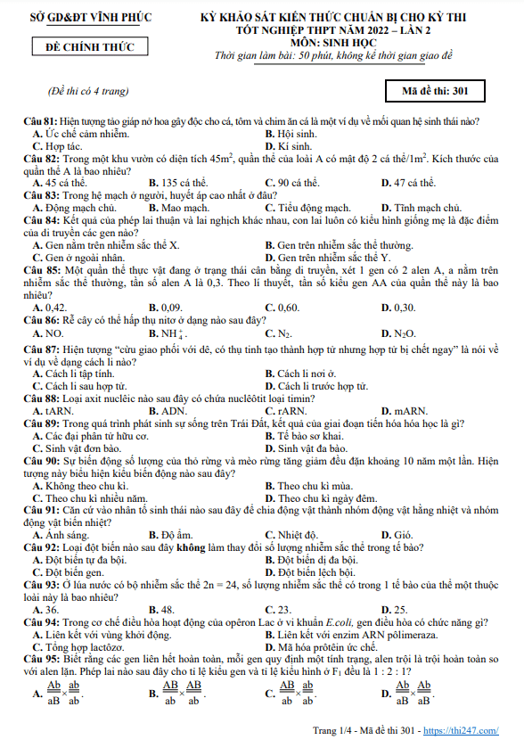 Đề thi thử tốt nghiệp THPT 2022 môn Sinh học lần 2 sở GD&ĐT Vĩnh Phúc