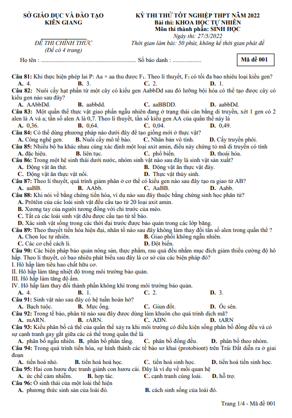 Đề thi thử tốt nghiệp THPT năm 2022 môn Sinh học sở GD&ĐT Kiên Giang