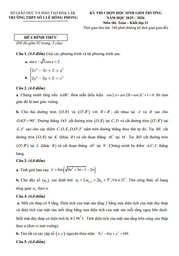 Đề cương giữa kì 2 Toán 11 năm 2025 – 2026 trường THPT Hướng Hóa – Quảng Trị 25/02/2026
