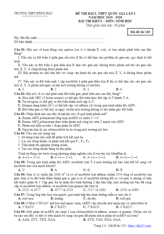 Đáp án đề Tham Khảo Môn Sinh Học Thi THPT Quốc Gia Năm 2020