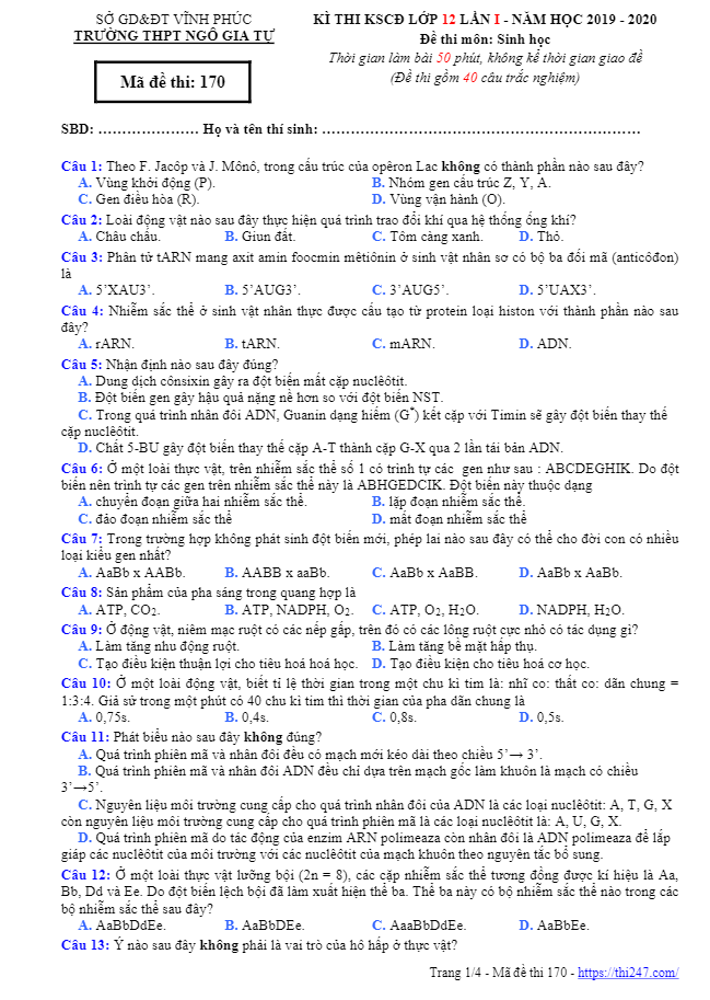 Đề khảo sát Sinh học 12 lần 1 năm 2019 – 2020 trường Ngô Gia Tự – Vĩnh Phúc