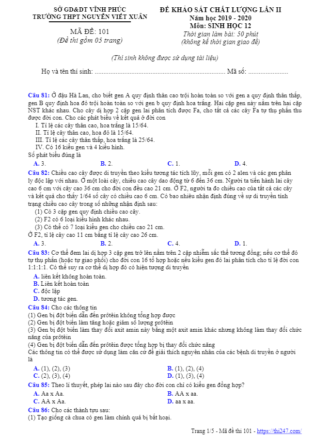Đề khảo sát Sinh học 12 lần 2 năm 2019 – 2020 trường Nguyễn Viết Xuân – Vĩnh Phúc