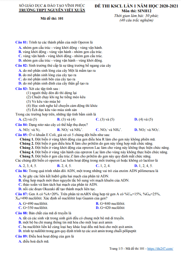 Đề khảo sát Sinh học 12 lần 1 năm 2020 – 2021 trường Nguyễn Viết Xuân – Vĩnh Phúc