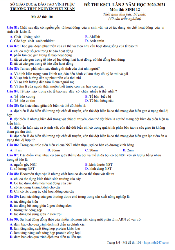 Đề khảo sát Sinh học 12 lần 3 năm 2020 – 2021 trường Nguyễn Viết Xuân – Vĩnh PhúcTÌM KIẾM