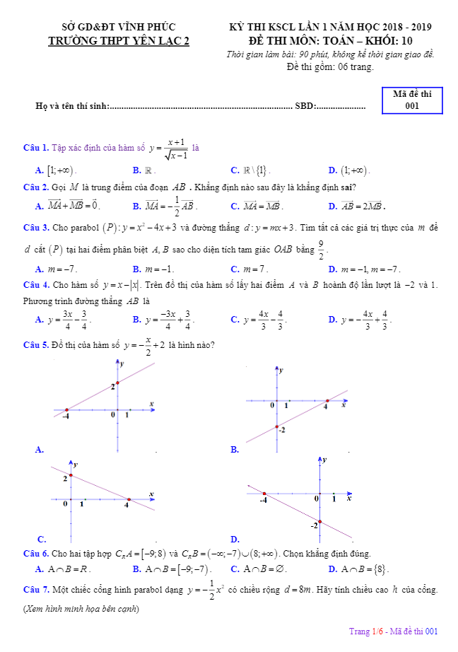 Đề KSCL Toán 10 năm 2018 – 2019 trường THPT Đồng Đậu – Vĩnh Phúc lần 1