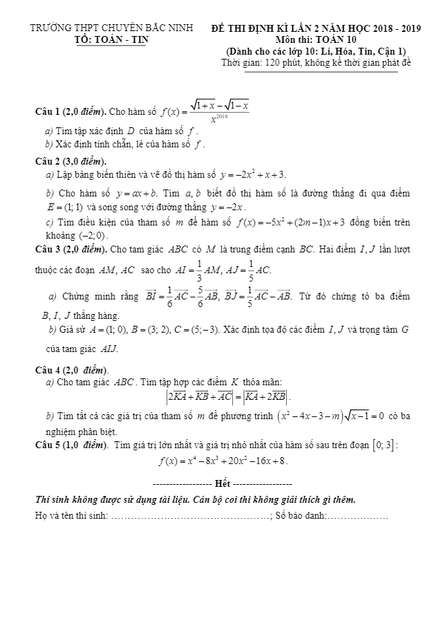 Đề thi định kỳ lần 2 Toán 10 năm 2018 – 2019 trường THPT chuyên Bắc Ninh