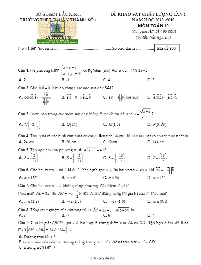 Đề KSCL Toán 10 lần 1 năm 2018 – 2019 trường THPT Thuận Thành 1 – Bắc Ninh