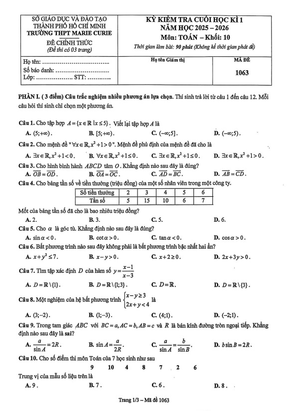 Đề cuối học kì 1 Toán 10 năm 2025 – 2026 trường THPT Marie Curie – TP HCM 18/12/2025