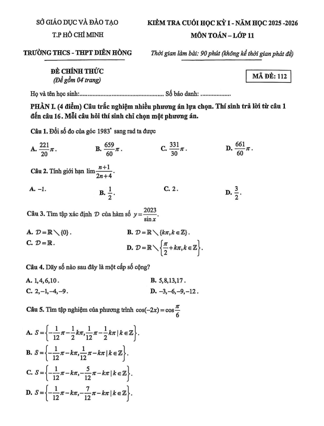 Đề cuối kỳ 1 Toán 11 năm 2025 – 2026 trường THCS-THPT Diên Hồng – TP HCM 18/12/2025