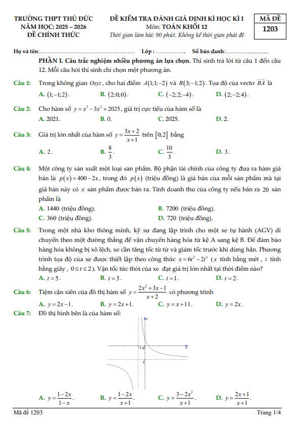 Đề học kì 1 Toán 12 năm 2025 – 2026 trường THPT Thủ Đức – TP HCM 18/12/2025