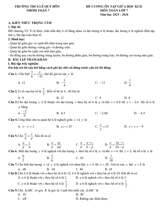 Đề cương giữa học kì 2 Toán 7 năm 2025 – 2026 trường THCS Lê Quý Đôn – Hà Nội 28/02/2026