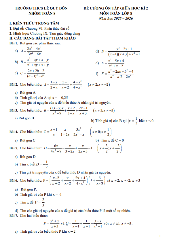 Đề cương giữa học kì 2 Toán 8 năm 2025 – 2026 trường THCS Lê Quý Đôn – Hà Nội 28/02/2026