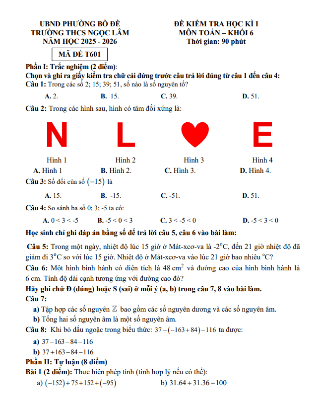 Đề cuối học kì 1 Toán 6 năm 2025 – 2026 trường THCS Long Toàn – TP HCM 09/01/2026