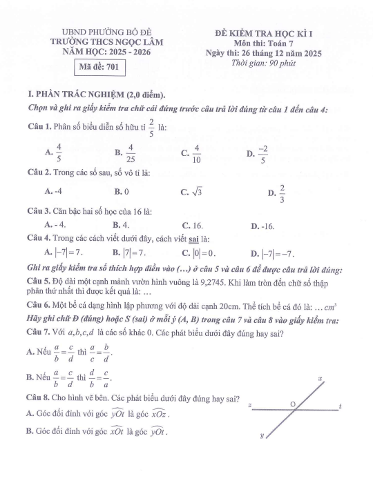 Đề cuối học kỳ 1 Toán 7 năm 2025 – 2026 trường THCS Võ Trường Toản – TP HCM 09/01/2026