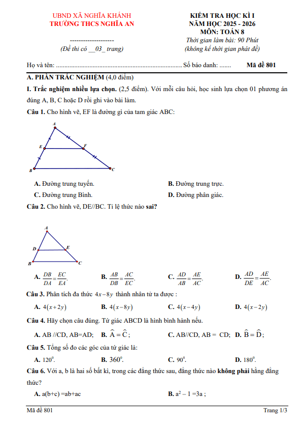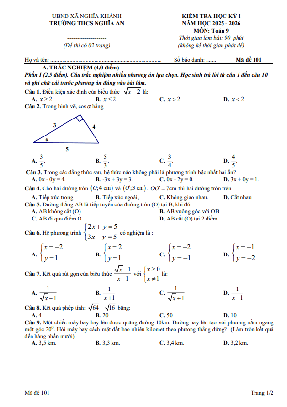 Đề Thi Giữa HK1 Toán 9 Đề giữa học kỳ 1 Toán 9 năm 2025 – 2026 trường THCS Tống Văn Trân – Ninh Bình