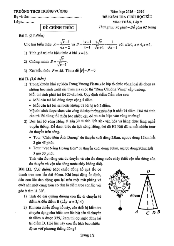 Đề Thi Giữa HK1 Toán 9 Đề giữa học kỳ 1 Toán 9 năm 2025 – 2026 trường THCS Trưng Vương – Hà Nội